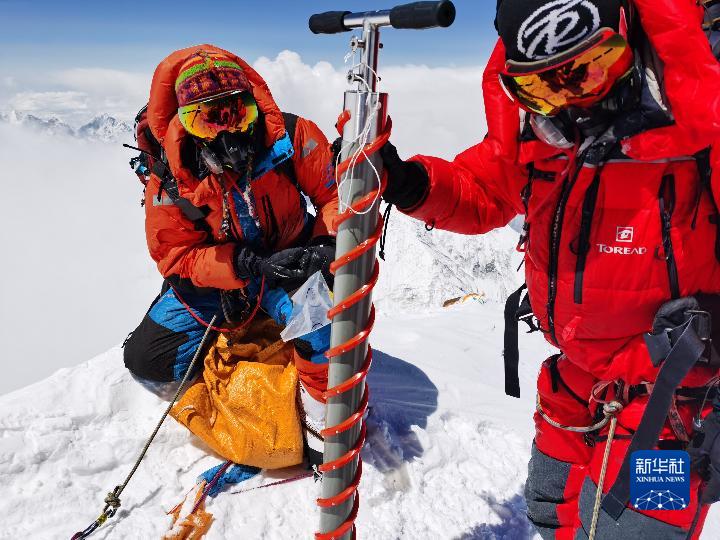科考隊員在珠穆朗瑪峰峰頂采集冰雪樣品(5月4日攝)。新華社特約記者 索朗多吉 攝