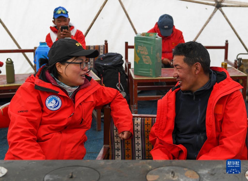 蘭州大學泛第三極環(huán)境中心劉勇勤教授(左)與順利返回大本營的登頂科考隊員德慶歐珠交流情況。(5月5日攝)。新華社記者 姜帆 攝