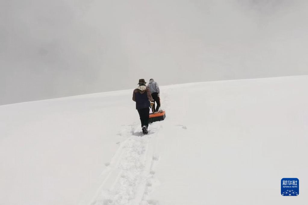 科考人員拉著冰川雷達(dá)測(cè)厚儀開展測(cè)量工作。(受訪者供圖)