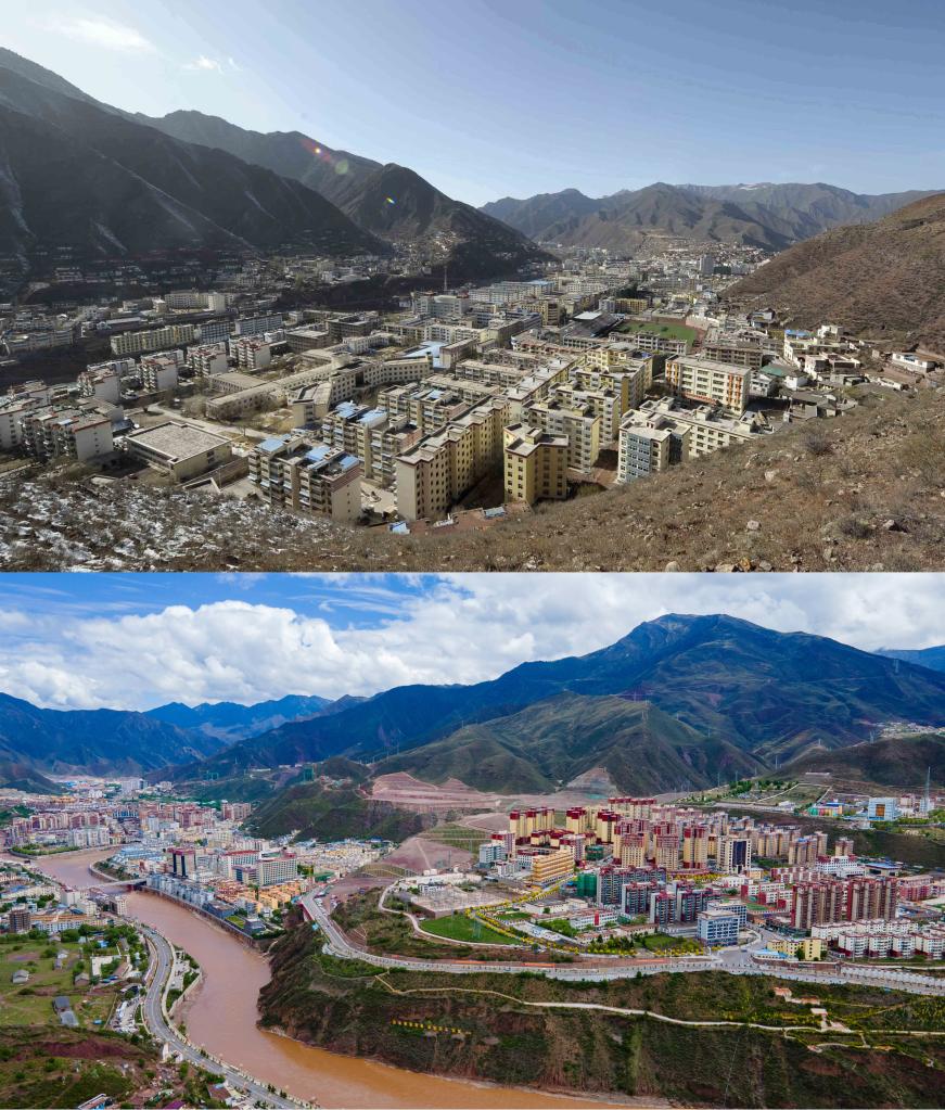拼版照片:上圖是2009年3月15日拍攝的昌都(新華社記者 普布扎西 攝);下圖是2022年5月22日拍攝的昌都市卡若區(qū)(新華社記者 周荻瀟 攝,無人機照片)。新華社發(fā)