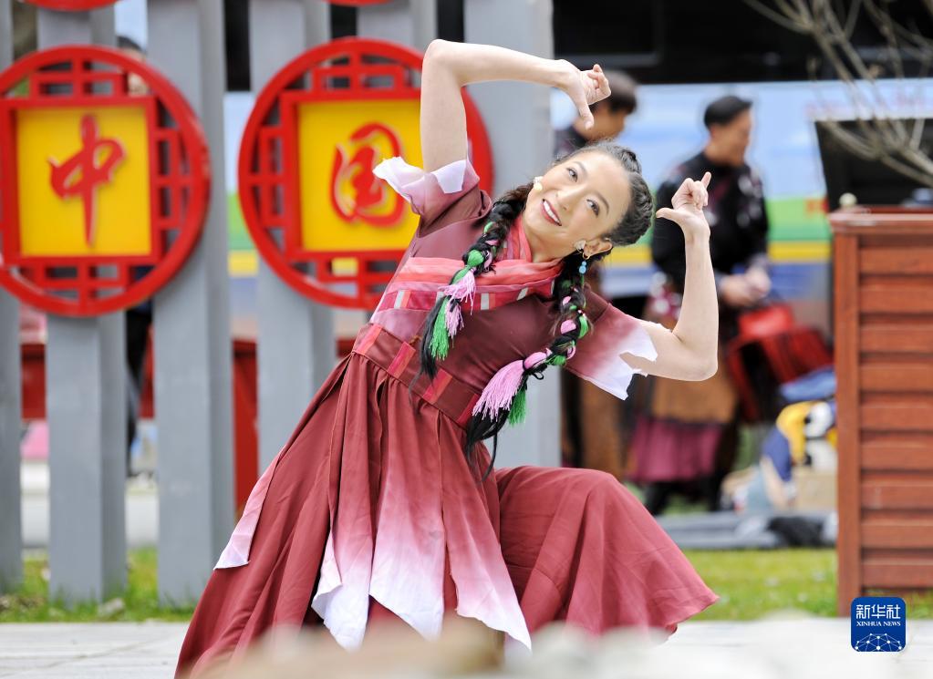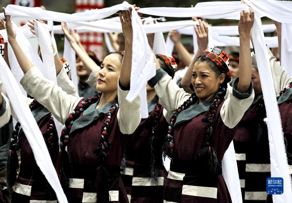 5月31日,演員在隆子縣玉麥鄉(xiāng)文化廣場(chǎng)表演歌舞劇《天邊格?;ā?。新華社記者 張汝鋒 攝