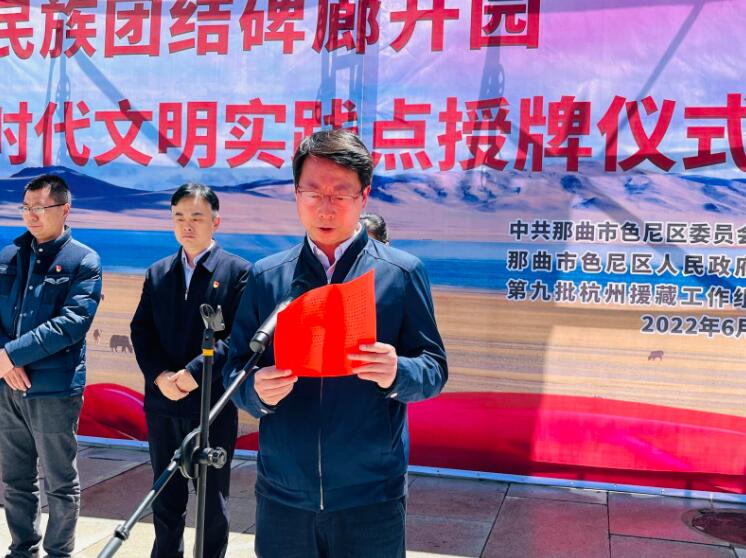 李東表示,西藏首個民族團結碑廊——杭州民族團結碑廊開園暨那曲市新時代文明實踐點授牌儀式的舉行,標志著色尼區(qū)新打造的愛國主義教育和民族團結教育基地正式運行,對色尼區(qū)推進新時代文明實踐工作更加有形有為,創(chuàng)建全國民族團結進步模范區(qū)具有重要意義。希望色尼各族干部群眾不斷鞏固“團結穩(wěn)定是福、分裂動亂是禍”的思想認識根基,維護祖國統(tǒng)一,加強民族團結,旗幟鮮明反對分裂,努力提升民族團結工作的成效,為創(chuàng)建全國民族團結進步模范區(qū)作出積極貢獻。