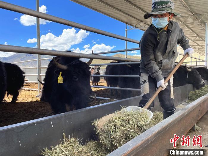 圖為拉薩市林周縣格桑塘現(xiàn)代農(nóng)牧業(yè)產(chǎn)業(yè)示范園內(nèi),工作人員為牦牛準(zhǔn)備飼料。冉文娟 攝