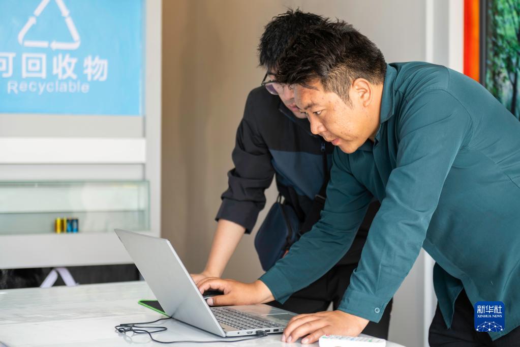 “格?;ㄩ_”大學(xué)生就業(yè)創(chuàng)業(yè)特訓(xùn)營學(xué)員、西藏墨竹工卡格?;ㄩ_大學(xué)生創(chuàng)業(yè)管理有限公司創(chuàng)辦人頓珠次仁(右)在墨竹工卡縣生活垃圾分類宣教中心講解垃圾分類常識(shí)(2022年6月23日攝)。新華社記者 周荻瀟 攝