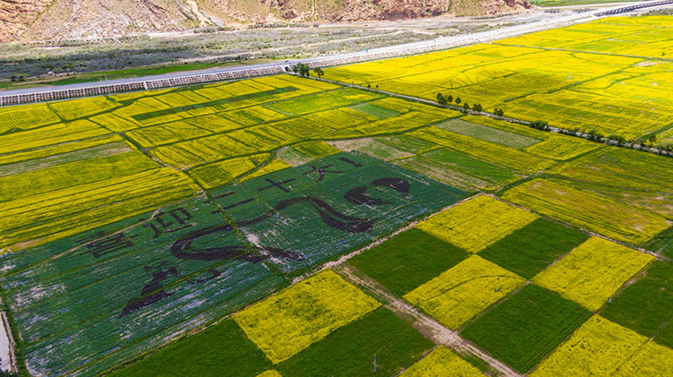 圖為航拍油菜花組成的“松贊故里 幸福墨竹”圖案。