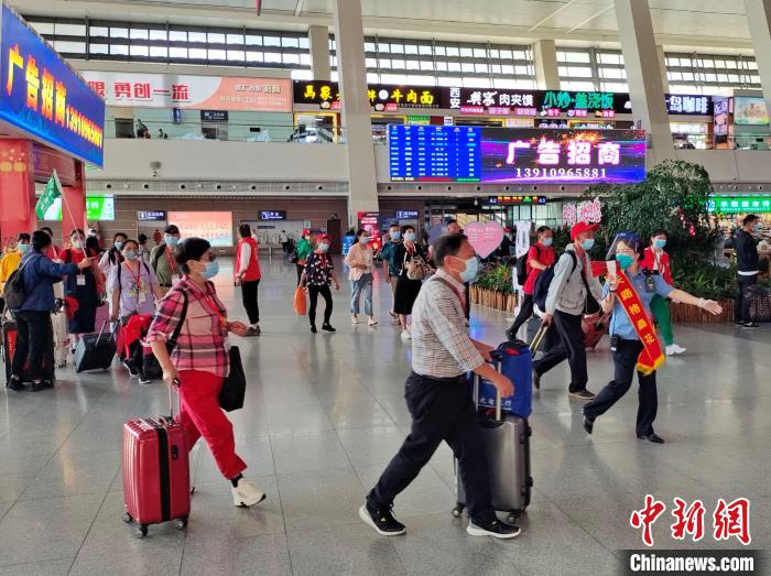 圖為西寧車站工作人員引導乘坐首趟暑期進藏旅游專列的旅客進站?;艚饌?攝