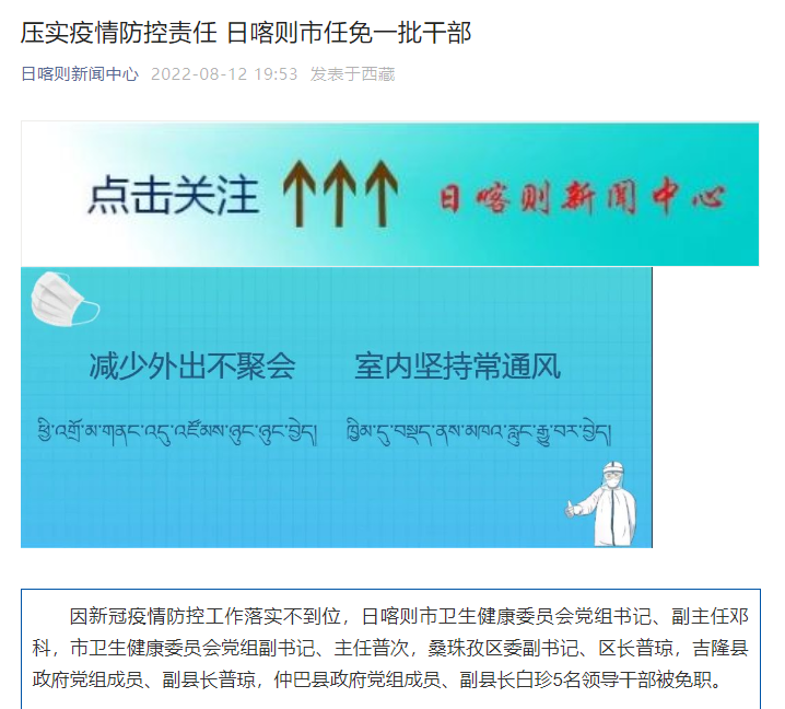 據(jù)日喀則新聞中心微信公眾號(hào)消息,因新冠疫情防控工作落實(shí)不到位,日喀則市衛(wèi)生健康委員會(huì)黨組書記、副主任鄧科,市衛(wèi)生健康委員會(huì)黨組副書記、主任普次,桑珠孜區(qū)委副書記、區(qū)長普瓊,吉隆縣政府黨組成員、副縣長普瓊,仲巴縣政府黨組成員、副縣長白珍5名領(lǐng)導(dǎo)干部被免職。