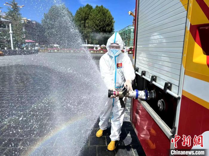 圖為拉薩消防指戰(zhàn)員在主城區(qū)進(jìn)行消殺?!±_市消防救援支隊 攝