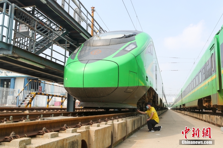 8月17日,北京車輛段西庫檢車間,檢修人員剛剛完成一列時(shí)速160公里動(dòng)力集中型復(fù)興號動(dòng)車組(俗稱“綠巨人”)的檢修工作。這里是京津冀地區(qū)唯一的“綠巨人”檢修維修基地,肩負(fù)著18列共計(jì)261節(jié)車輛的檢修任務(wù)。隨著暑運(yùn)逐漸迎來返校返程高峰,檢修人員也在加班加點(diǎn)為列車做好體檢工作,確保運(yùn)行安全。 中新社記者 賈天勇 攝
