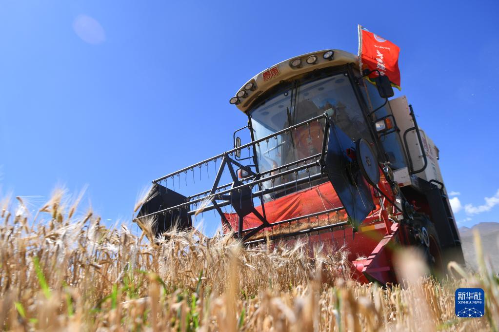 西藏日喀則市江孜縣熱索鄉(xiāng)努康村農(nóng)機(jī)合作社的村民集中對(duì)村里三千多畝耕地進(jìn)行機(jī)械化收割(9月19日攝)。新華社記者 晉美多吉 攝