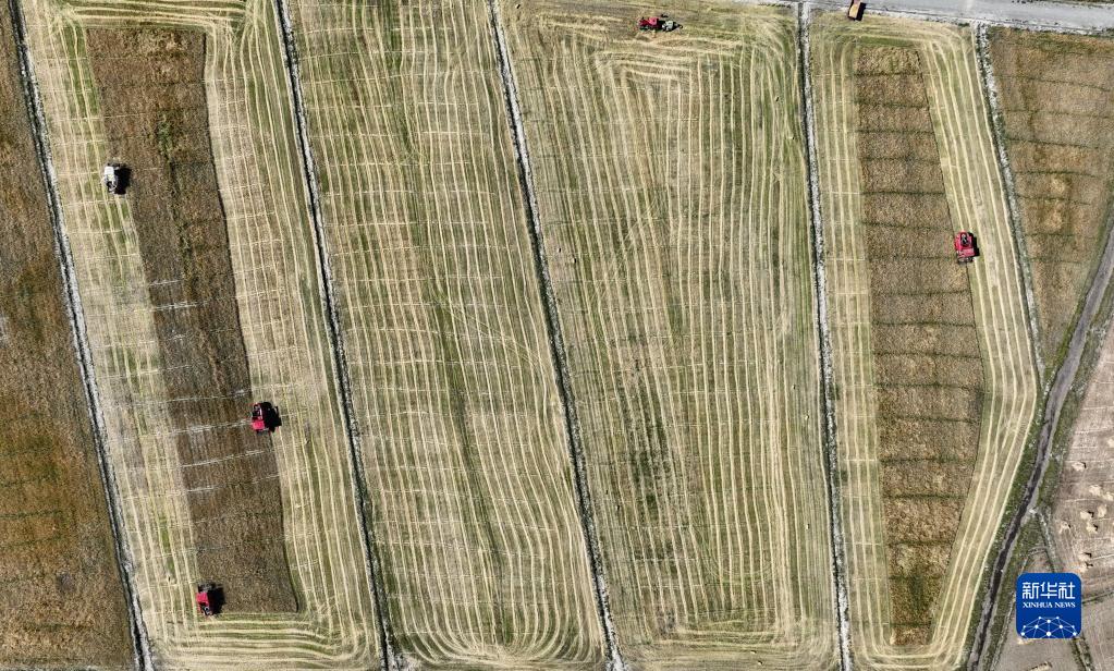 西藏日喀則市江孜縣熱索鄉(xiāng)努康村農(nóng)機(jī)合作社的村民集中對(duì)村里三千多畝耕地進(jìn)行機(jī)械化收割(9月19日攝,無(wú)人機(jī)照片)。新華社記者 晉美多吉 攝