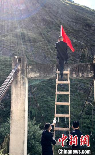 巡邏間隙,移民管理警察攻國杰在口岸遺址上方更換國旗。 郭章統(tǒng) 攝