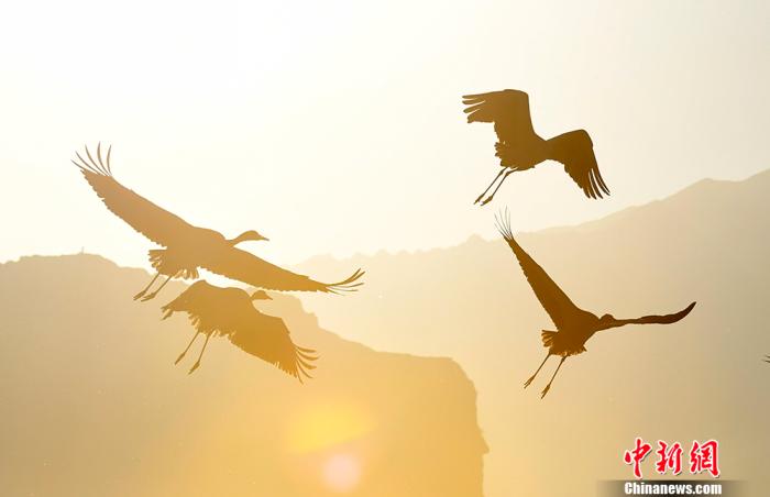 資料圖為2019年12月29日,拉薩市林周縣黑頸鶴展翅高飛。 中新社記者 李林 攝