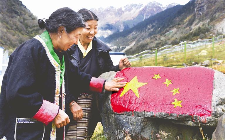 圖為“家是玉麥,國是中國”,人人爭做神圣國土守護者、幸福家園建設者。圖為“七一勛章”獲得者卓嘎和同為“時代楷?!钡拿妹醚胱诘诌呇策?。