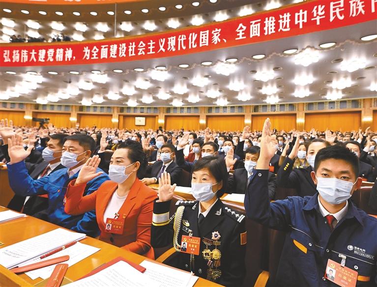 圖為10月22日,中國(guó)共產(chǎn)黨第二十次全國(guó)代表大會(huì)在北京人民大會(huì)堂勝利閉幕。這是代表舉手表決。新華社記者 申宏 攝