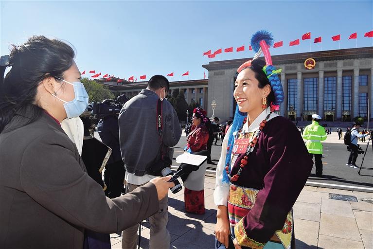 次仁拉姆代表表示,回望來(lái)時(shí)路,新時(shí)代十年的成就令人振奮;展望前行路,新征程的藍(lán)圖催人奮進(jìn)。曲措代表說(shuō):“當(dāng)代中國(guó)青年是幸運(yùn)的,施展才華的舞臺(tái)無(wú)比廣闊,實(shí)現(xiàn)夢(mèng)想的前景無(wú)比光明。我將懷抱夢(mèng)想,腳踏實(shí)地,回去后認(rèn)真學(xué)習(xí)好、宣傳好、貫徹好黨的二十大精神,并切實(shí)擔(dān)負(fù)起新時(shí)代新征程賦予的使命與責(zé)任?!蹦岈斃诖碚f(shuō):“作為一名基層干部,我將按照黨中央要求,吃透黨的二十大精神,狠抓落實(shí),用心用情用力解決群眾‘急難愁盼’問(wèn)題,投身美麗幸福西藏建設(shè),守護(hù)好祖國(guó)每一寸土地?!?/p>