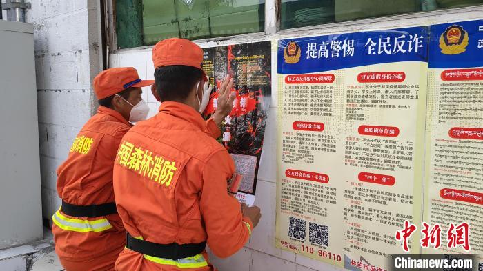 消防隊(duì)員正在張貼標(biāo)語。 袁永斌 攝