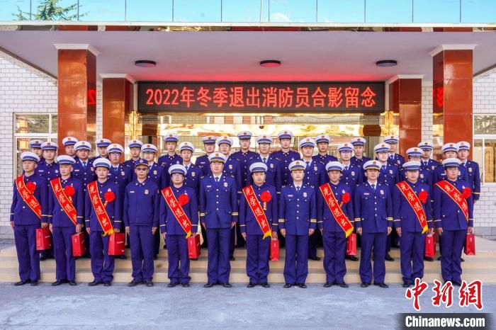 圖為退出消防員合影留念?!±顕鵂c 攝