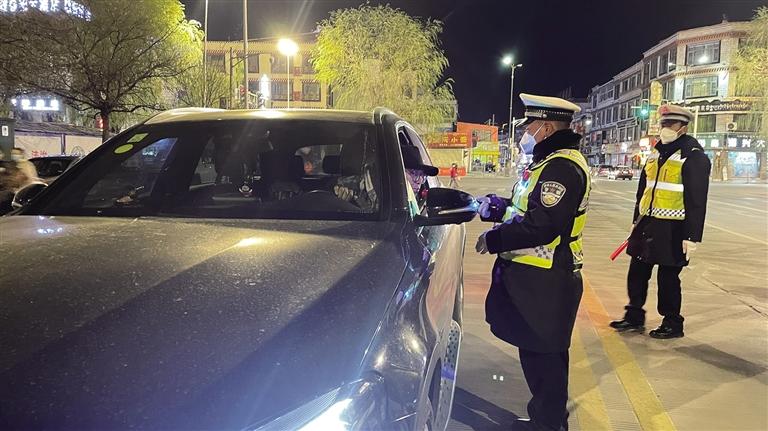 拉薩冬日的夜晚寒風(fēng)凜冽。夜色中,一輛輛汽車有序通行,街道又恢復(fù)了往日的熱鬧。當(dāng)天晚上9時(shí)許,記者跟隨拉薩市公安局交警支隊(duì)執(zhí)法監(jiān)督大隊(duì)民警前往江蘇大道,城南大隊(duì)的民警已經(jīng)設(shè)置好路障、標(biāo)牌,正在對過往車輛逐一進(jìn)行詳細(xì)排查?!澳茫埑鍪抉{照。”“您好,請吹氣?!痹诿窬闹笓]下,車輛有序通過檢查點(diǎn)。市民扎西多吉駕車經(jīng)過檢查點(diǎn)后告訴記者,在這么冷的天氣里,交警依然堅(jiān)守在路面上,確實(shí)令人敬佩,應(yīng)該為他們點(diǎn)贊?!拔視?huì)牢記‘開車不喝酒,喝酒不開車’,也會(huì)自覺遵守交通法律法規(guī),文明出行?!痹鞫嗉f。