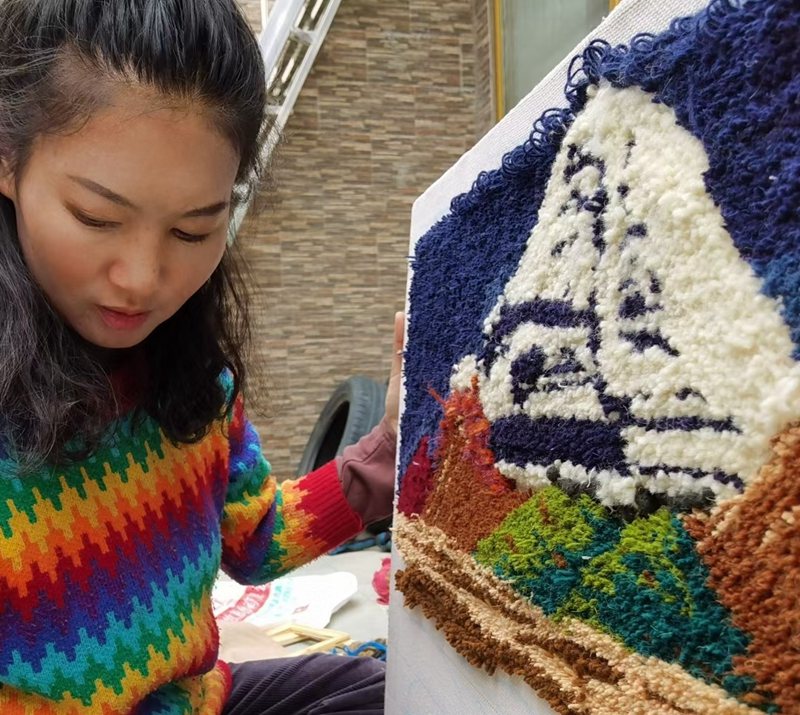不過,起初也遇到了不少困難和挑戰(zhàn)?!鞍⒓褌儯ú卣Z:對年長女性的尊稱)的編織手藝都很棒,但她們幾乎沒上過學(xué),拘泥于傳統(tǒng)思維,創(chuàng)新力不足,做出來的產(chǎn)品花樣陳舊,一直打不開市場。而且她們對很多新鮮事物的接受度低,不愿意改變。比如她們只做色彩鮮艷的氆氌(藏族人民手工生產(chǎn)的一種毛織品,可做衣服、床毯等)。我想打破慣常思維,做一些時髦的產(chǎn)品出來。”次仁曲珍回憶。