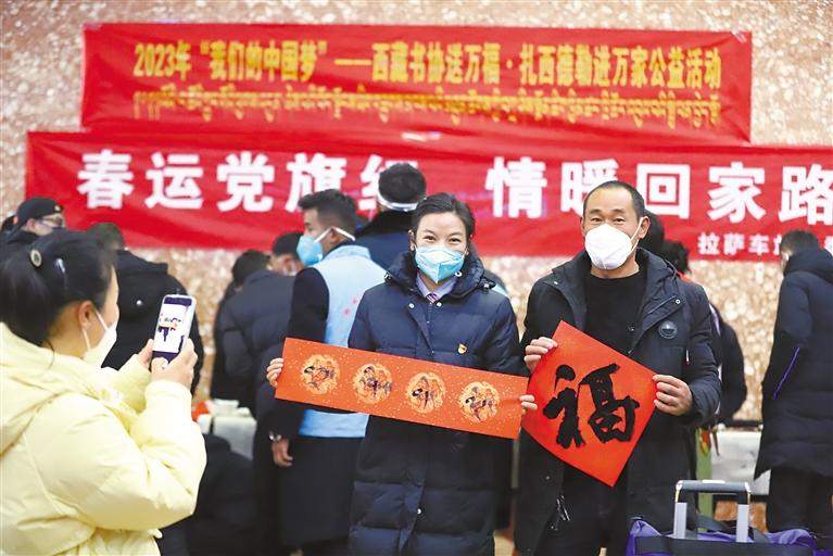 7日,拉薩火車(chē)站“天路格?;ā秉h員突擊隊(duì)開(kāi)展兔年大吉心愿墻、新春猜謎送祝福等活動(dòng),提升鐵路運(yùn)輸服務(wù)品質(zhì),讓旅客安心、順心出行。圖為拉薩火車(chē)站的工作人員將“?!弊炙徒o旅客。記者 楊小娟 旦增蘭澤 攝