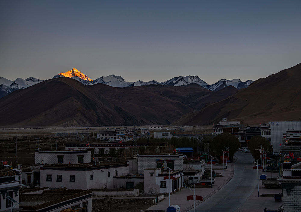 落日余暉灑在珠峰上,扎西宗鄉(xiāng)慢慢沉睡(2022年5月10日攝)。
