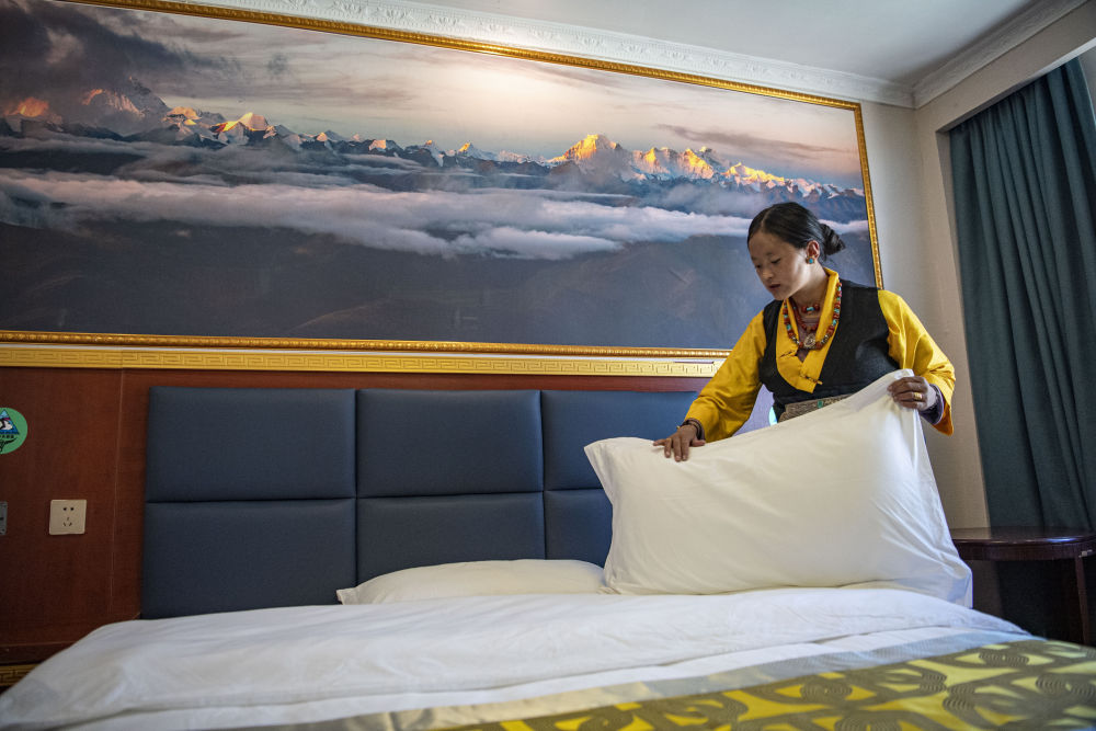 次仁格旦的妻子央宗正在收拾客房(2022年5月10日攝)。