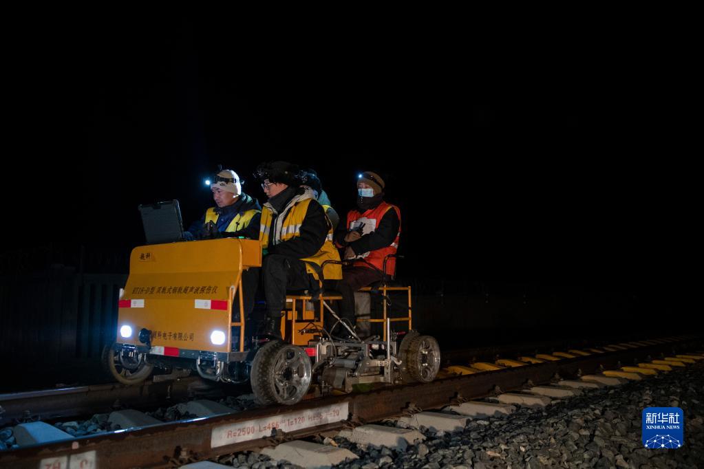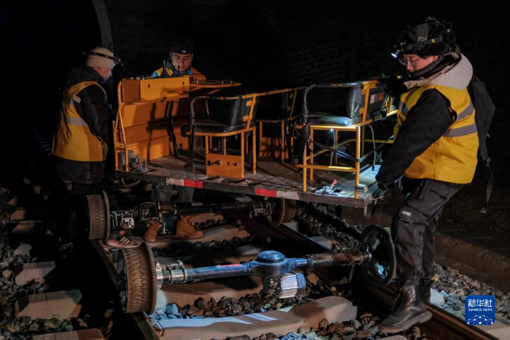 鋼軌探傷隊員在拉林鐵路進行鋼軌探傷作業(yè)(1月12日攝)。新華社記者 孫非 攝