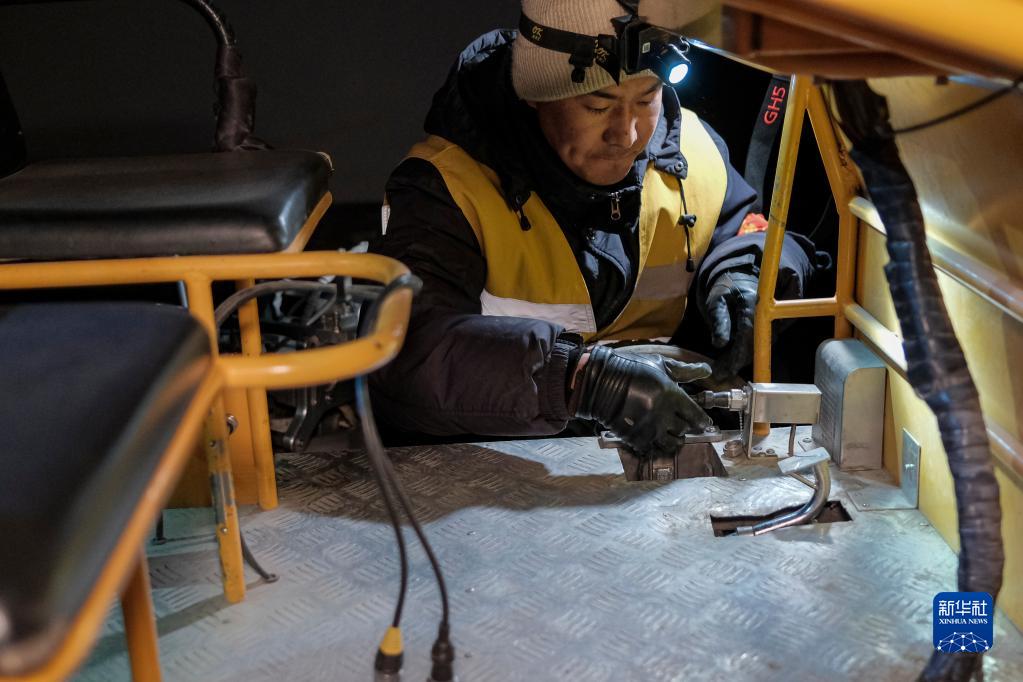 羅布和同事進行鋼軌探傷前的準備工作(1月12日攝)。新華社記者 孫非 攝