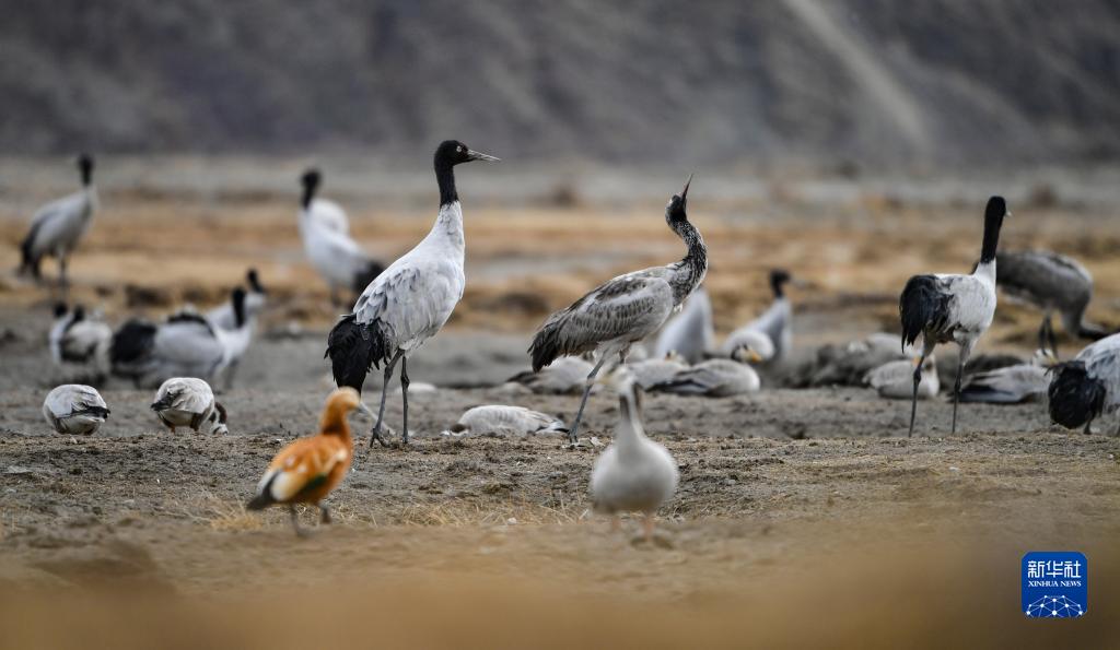 在西藏雅魯藏布江中游河谷黑頸鶴國家級自然保護區(qū)日喀則市拉孜縣越冬的黑頸鶴(1月23日攝)。新華社記者 孫非 攝