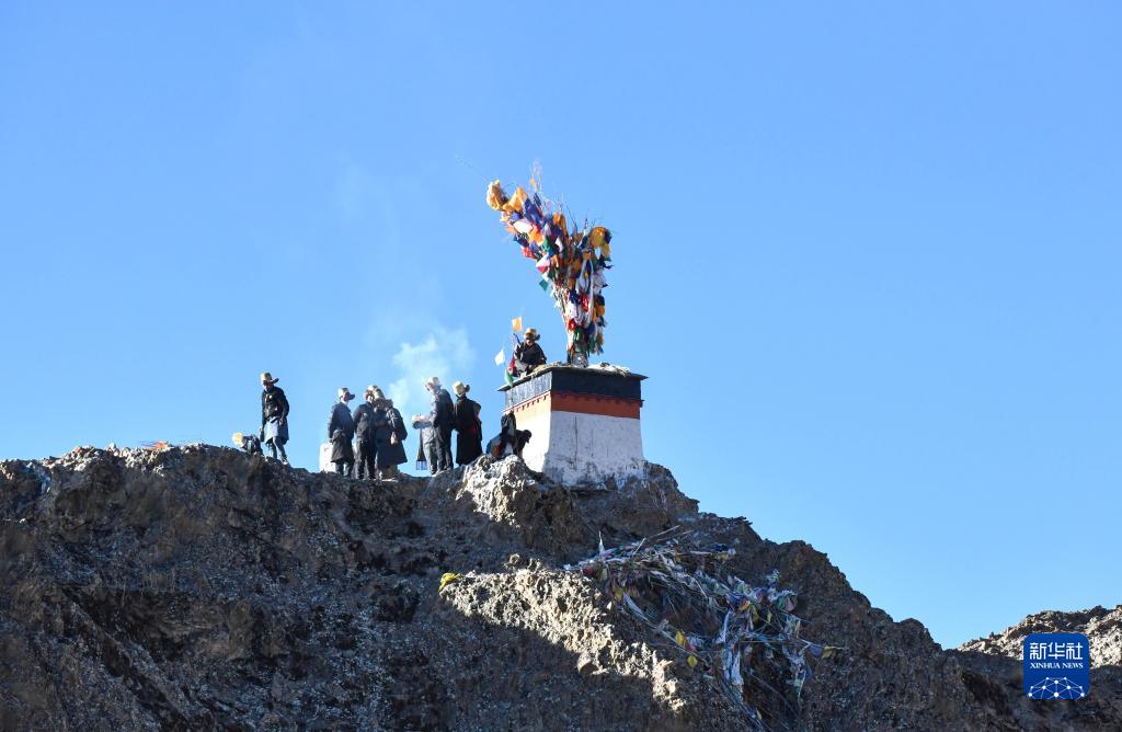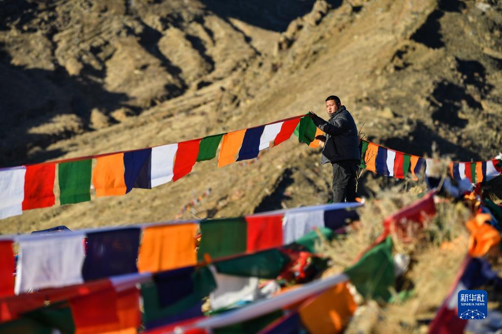 1月23日,西藏拉孜縣曲瑪鄉(xiāng)的藏族群眾在山上豎起五彩經(jīng)幡。新華社記者 晉美多吉 攝