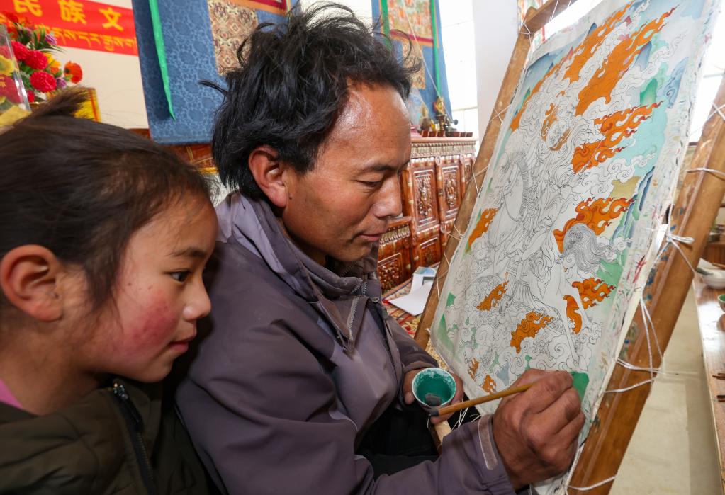 西繞尼瑪認為,唐卡繪制不僅要繼承傳統(tǒng)技藝,還要注重時代創(chuàng)新。“現(xiàn)在生活這么好,我們要用創(chuàng)新作品來記錄這個時代。”他說,傳承傳統(tǒng)技藝和將時代元素融入創(chuàng)作中,對唐卡技藝來說就像左手和右手一樣重要。