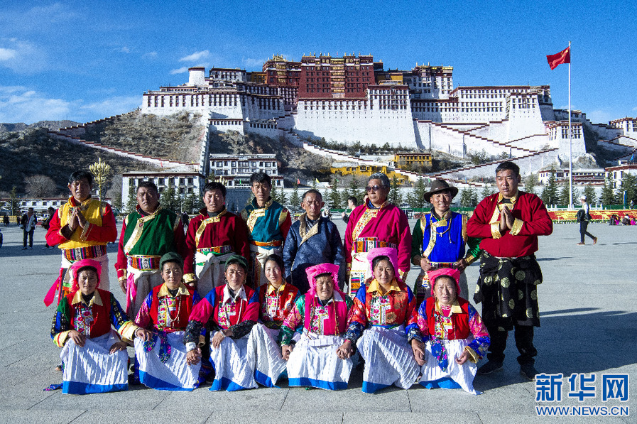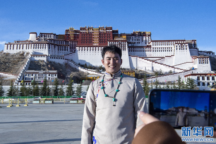 來(lái)自云南的游客在布達(dá)拉宮廣場(chǎng)拍照留念(1月30日攝)。新華網(wǎng) 旦增努布 攝
