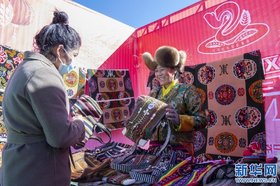 2月6日,達孜區(qū)旦卓婦女卡墊專業(yè)合作社工作人員在交易會上推銷傳統(tǒng)手工制品。新華網(wǎng)旦增努布攝
