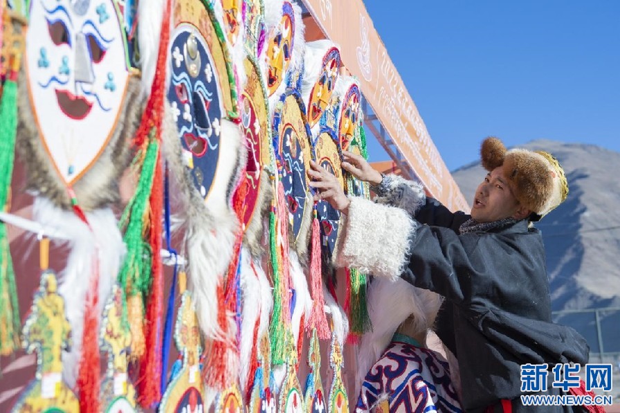 2月6日,達孜區(qū)阿古傳統(tǒng)藏戲服飾農(nóng)牧民專業(yè)合作社工作人員在交易會上推銷藏戲面具。新華網(wǎng) 旦增努布 攝