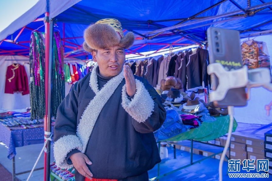 2月6日,商戶在交易會上通過直播介紹年貨。新華網(wǎng) 旦增努布 攝