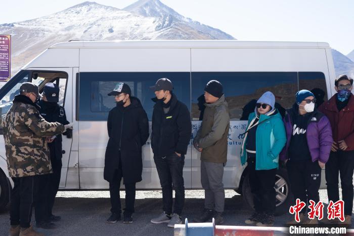 圖為游客排隊接受檢查證件。 貢嘎來松 攝