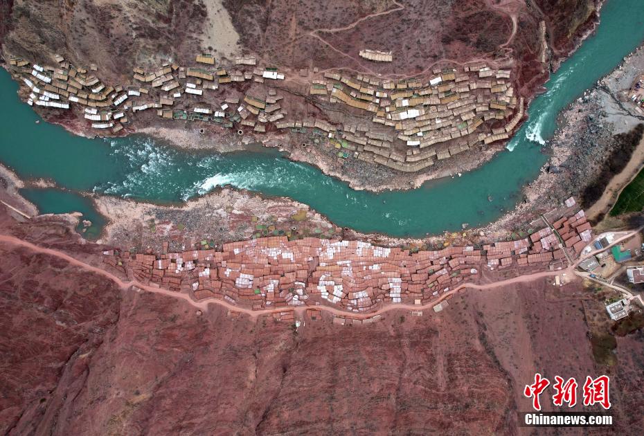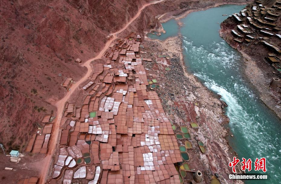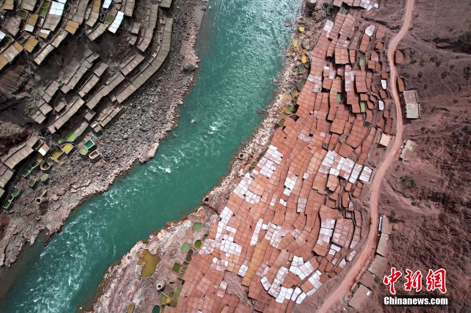 在西藏昌都芒康縣納西民族鄉(xiāng)瀾滄江兩側(cè),有一處古老的、大大小小數(shù)千塊鹽田。史料記載,當(dāng)?shù)貢覃}歷史距今已有1000多年。木柱搭建的鹽田,高低錯落,依河谷山勢,在臨江兩岸蔓延。當(dāng)?shù)孛癖姀慕系柠}井、鹽池中抽出鹵水,引入鹽田,經(jīng)過陽光與風(fēng)的杰作,結(jié)晶成鹽。進入鹽田,房內(nèi)頂部到處懸掛鐘乳狀晶鹽,仿若“水晶宮”的世界。圖為2月13日,西藏昌都芒康千年古鹽田。(無人機照片)