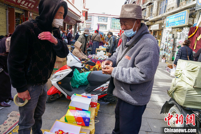 圖為2月13日,拉薩沖賽康市場(chǎng)周圍,市民(右)向29歲的巴桑(左)購(gòu)買藏歷新年年貨酥油花。中新社記者 江飛波 攝