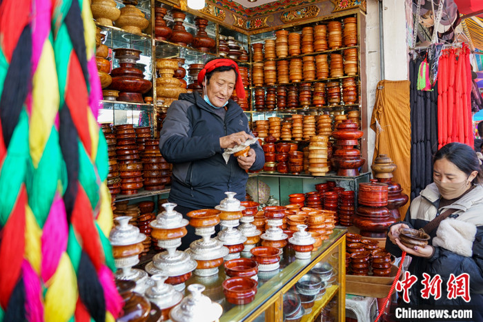 圖為2月13日,拉薩沖賽康市場(chǎng),商戶阿旺次仁(左)向顧客銷售藏式木碗。中新社記者 江飛波 攝