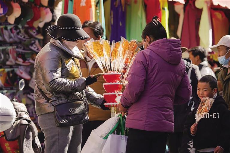“市場(chǎng)現(xiàn)有1200多家商戶(hù),經(jīng)營(yíng)商品有零食、蔬菜、肉類(lèi)、干雜、五金、服裝等。藏歷新年臨近,每天前來(lái)置辦年貨的市民絡(luò)繹不絕,日均人流量超1萬(wàn)。為保證藏歷新年期間年貨充足,市場(chǎng)商戶(hù)們提前籌備、積極備貨,目前,各類(lèi)商品庫(kù)存充足、品種豐富,基本上能夠滿(mǎn)足不同消費(fèi)者的需求?!睕_賽康商貿(mào)有限公司負(fù)責(zé)人尼瑪告訴記者。此外,沖賽康市場(chǎng)將于2月19日至27日暫停營(yíng)業(yè),28日起正常營(yíng)業(yè)。