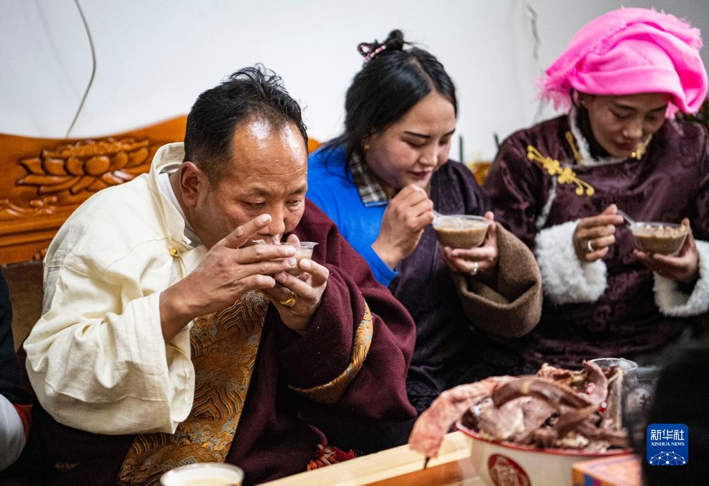 在位于森布日安置點(diǎn)的家中,石秀次仁一家正在吃“古突”(2月19日攝)。