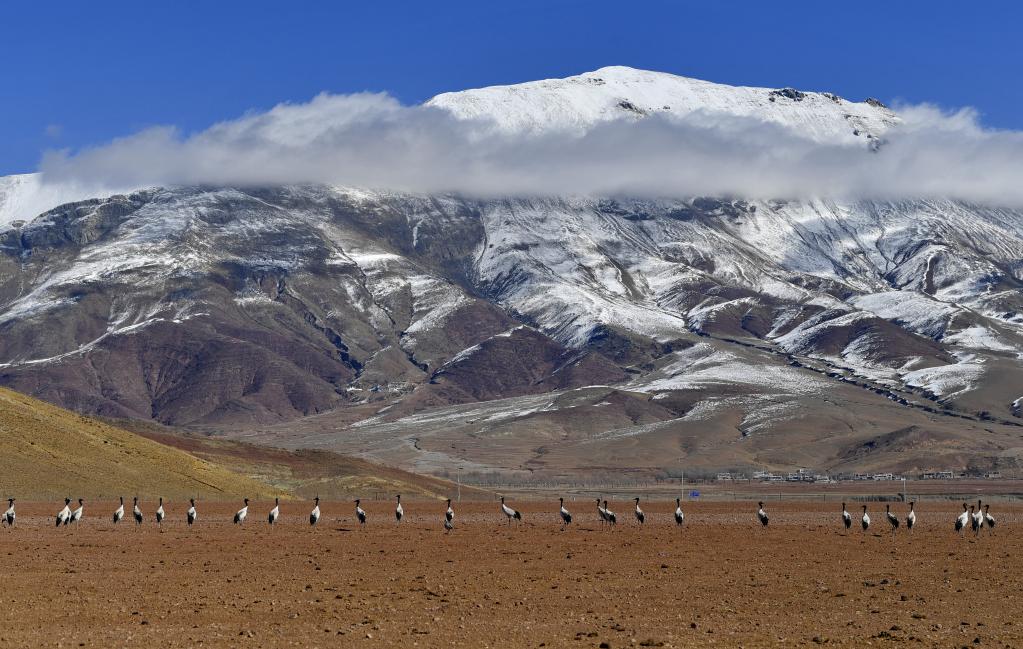 在拉薩市林周縣的農(nóng)田里覓食的黑頸鶴(3月1日攝)。新華社記者 張汝鋒 攝