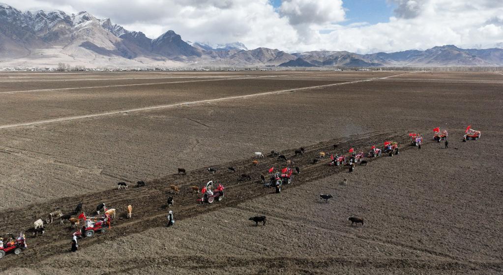 西藏林周縣強(qiáng)嘎村的春耕儀式(無人機(jī)照片)(3月16日攝)。新華社記者 晉美多吉 攝