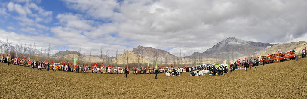 當(dāng)天是藏歷正月二十四日,據(jù)藏族天文歷算,是西藏農(nóng)區(qū)開耕的日子。上午9時(shí)許,強(qiáng)嘎村村民身著盛裝,帶著青稞酒、酥油茶等物品聚在田間,共同舉行開耕儀式。