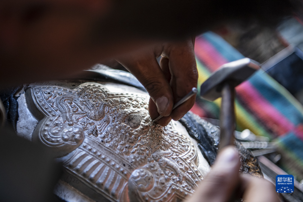 扎西吉彩金銀銅器加工廠工人在銀器上鏨刻花紋(3月9日攝)。新華社記者孫非 攝