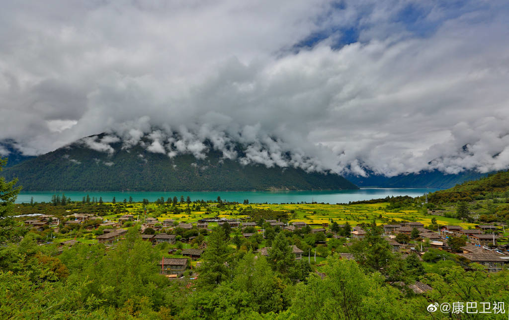 湖邊房舍錯(cuò)落,一湖如帶,濕地從湖邊村緩緩延展至湖畔,而海拔6300多米的杰青那拉嘎布雪山,照映在湖面,飄渺的云霧如從天上飄下……宛如一座世外桃源小仙境。