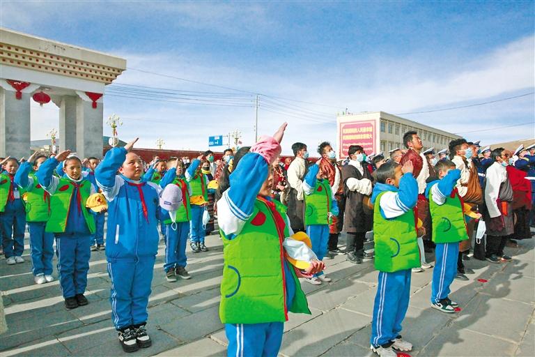 28日,西藏大學(xué)、拉薩市教育局組織學(xué)生開展“升國旗、唱國歌”活動,并觀看《復(fù)興之路》和《人格的力量——中國共產(chǎn)黨人的家國情懷》兩個直播課堂,革命先烈為實現(xiàn)國家解放和民族復(fù)興前仆后繼、視死如歸的英雄事跡深深打動了每一名學(xué)生。西藏大學(xué)學(xué)生向秋雨說:“我們要以史為鑒,開創(chuàng)未來,扎實學(xué)好專業(yè)知識,維護祖國統(tǒng)一,鑄牢中華民族共同體意識,讓青春之花在祖國最需要的地方絢麗綻放。”