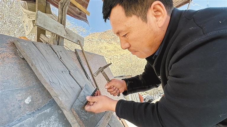 今年35歲的桑周才仁出生在石刻世家,父輩都是石匠,算起來(lái)他也是家族石刻技藝的第六代傳承人了。自幼,桑周才仁就對(duì)石頭有一種特殊的情感,14歲就開始接受父親的指導(dǎo),悉心學(xué)習(xí)刻字、線雕、浮雕、繪畫等與石刻相關(guān)的技藝?!翱套质鞘碳妓囍械幕A(chǔ),需要反復(fù)練習(xí),刻不好就得磨掉重做,直到刻出滿意的作品為止。”桑周才仁對(duì)記者說(shuō),當(dāng)時(shí)聽到父親一句“刻得很好”的評(píng)價(jià),他就能高興一整天。