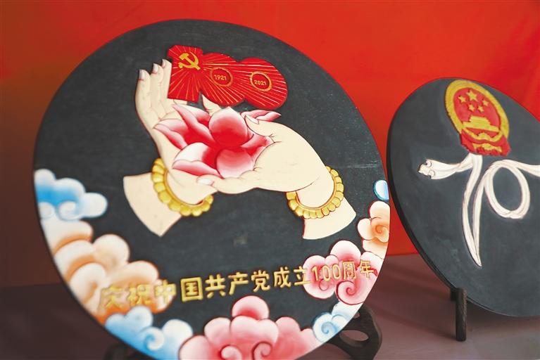 “我們首先要選好一塊石頭,根據(jù)它的形狀和質(zhì)地來(lái)決定刻成一幅什么樣的作品,然后再畫出作品的輪廓進(jìn)行雕刻,最后一步則為上色?!鄙V懿湃薀崆榈貛覀儏⒂^他的工作室,“慶祝中國(guó)共產(chǎn)黨成立100周年”“牧家生活”“扎西德勒”“白海螺”“和氣四瑞像”……每一幅作品活靈活現(xiàn)在大大小小石板上,栩栩如生、惟妙惟肖,堅(jiān)硬的石頭在他出神入化的雕工下竟變得柔軟,又不失力量和美感。